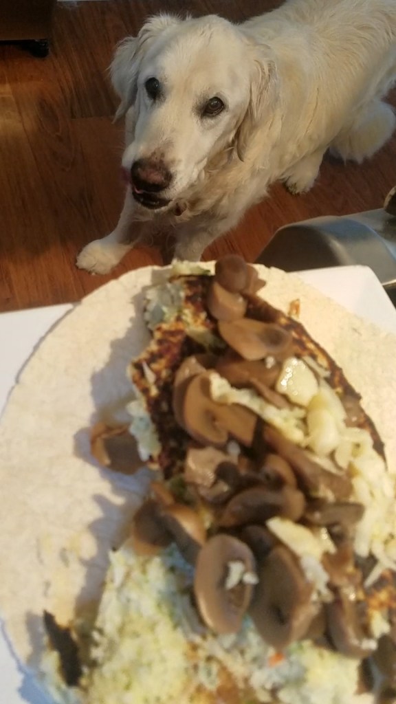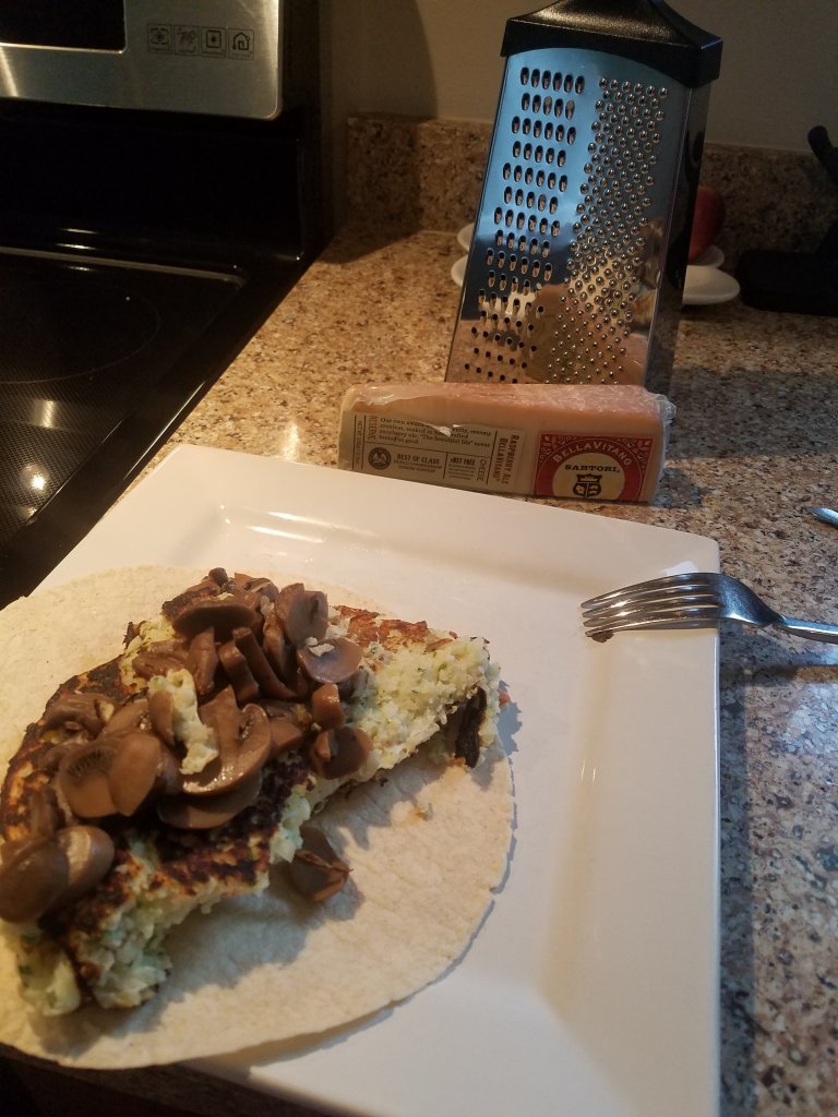 I reached for the sides in the frig, and bam, none found… I fretted, circled, how on earth could I possibly eat a bare wrap.. yuck! I couldn’t add the jalepenos because last week my throat suffered in the run. It had to be blan…Then, I recalled the shrooms! I fried them alongside the riced cauliflower egg white mix and measured an ounce of Bellavitano cheese. It was crumbling in my hand as I shredded it..darn green house Assembly the other caused my hands to be weak. Half of the cheese fell on the floor and the Fluffy one was pleased. He finally got a tidbit! The wrap was a win! It’s the little things in life…