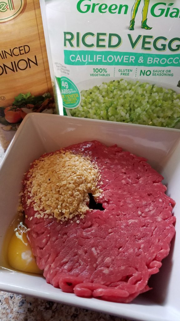 I was raised in a big family, so we always had to stretch the protein with a filler to feed the massive family. I reached for the riced cauliflower/ broccoli mix, egg and minced onion. It smelled like heaven! I brought out the scale and stretched 12 ounces of angus into 7 hamburger patties!