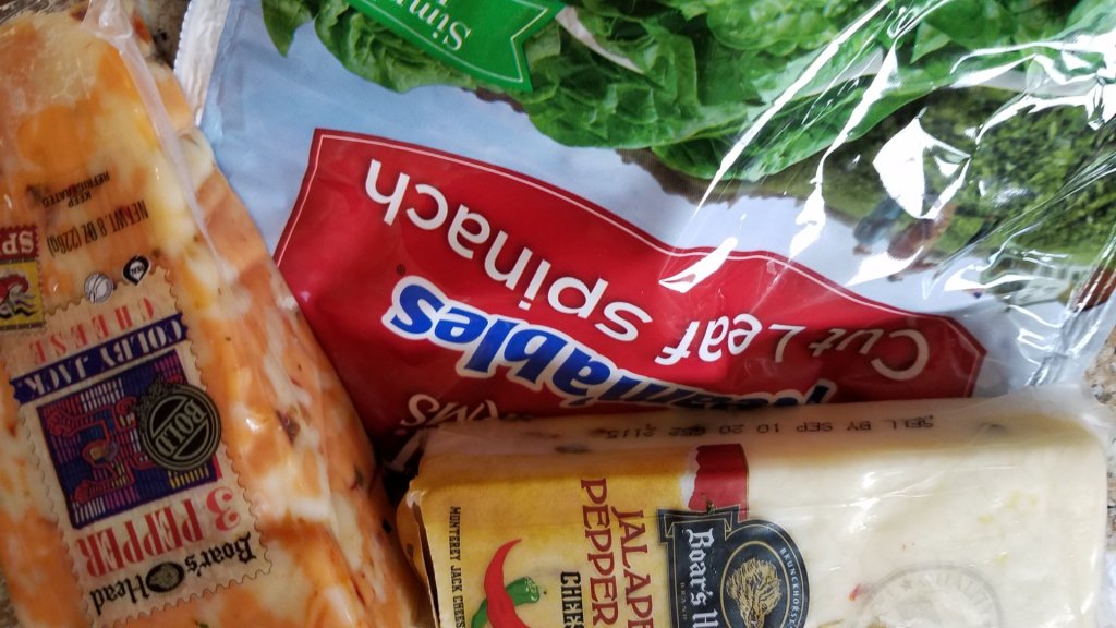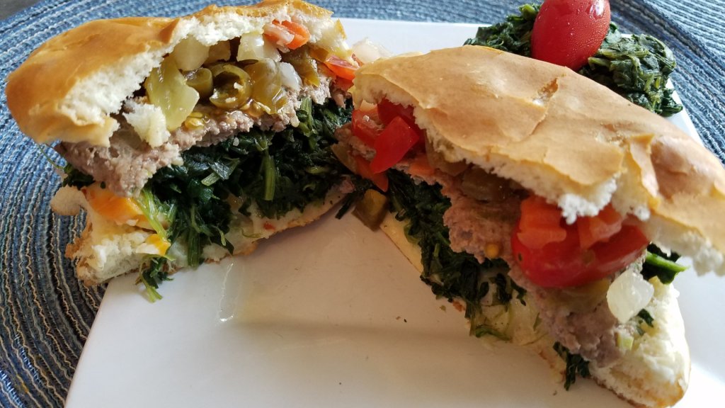 I piled Boars Head 3 Pepper Spice and Jalepeno cheese on the other side. Then, I added sliced cherry Tomatoes, spinach and Giardiniera. This all fit onto a bun that was gutted…the fluffy one helped eat that excess.