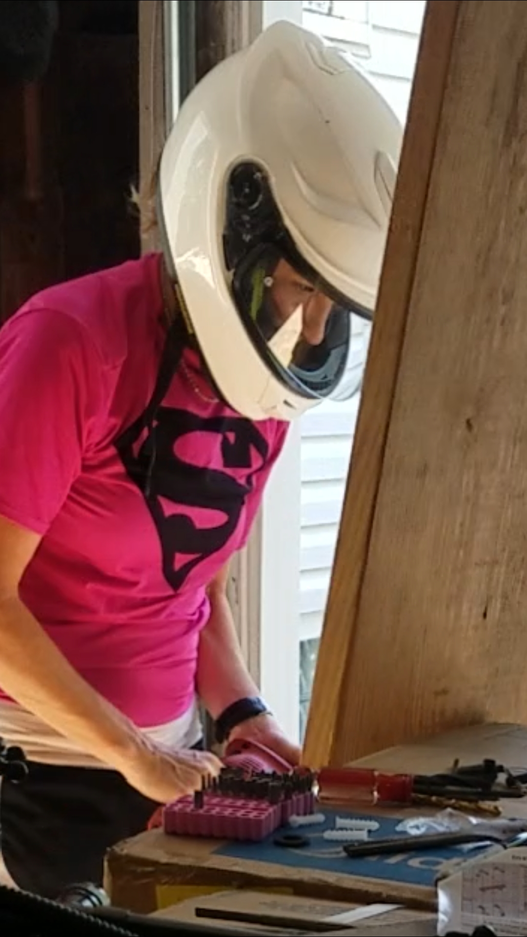 At the point of drilling bigger holes for the hot and cold water inlets, I got scared something would break. I recalled my high school teachers scar on his face. It was from a drill bit breaking and flying into his cheek. Naturally, I reached for the nearest safety device…my Shoei helmet. I drilled and drilled. One of the bits broke, but after it was used. Whew! Finally the holes were done.
