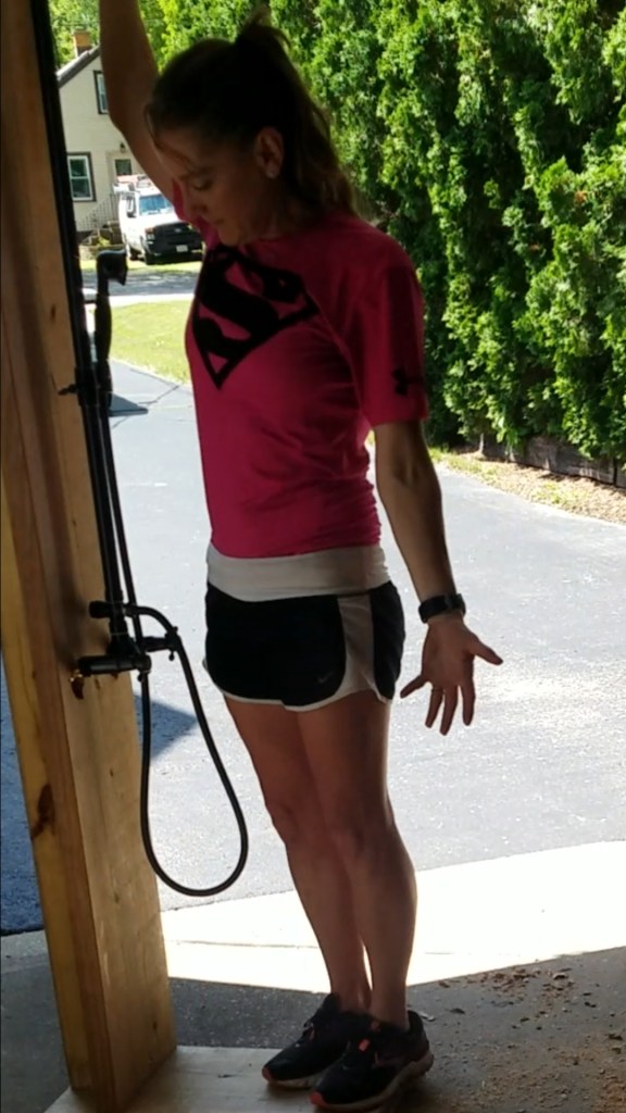 I grabbed our dolly and wheeled that baby into a corner nook by our house. We didn’t use that spot and it was perfect for a shower. Odddly, it had a pvc pipe drain too!
