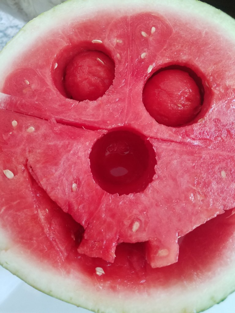 It was hot, the boy was bored…At lunch nobody was hungry so we got out the watermelon and gave her a face lift. Isn’t she pretty now?