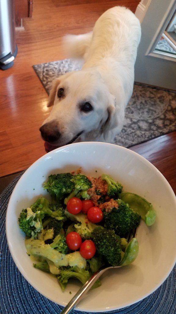Today was special because the garden that was grown from seed, has decided to produce! Somehow, my legs that cried of pain all day yesterday, recovered and flew through a 3 mile recovery run without complaint. They had recovered! I decided to pass on extra protein and go for a veggie late dinner at 8pm. Naturally, the Fluffy one was all in. He liked all 3 veggies, snow peas, broccoli, and cherries. What a day!?