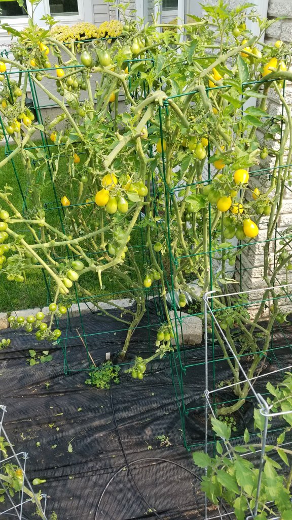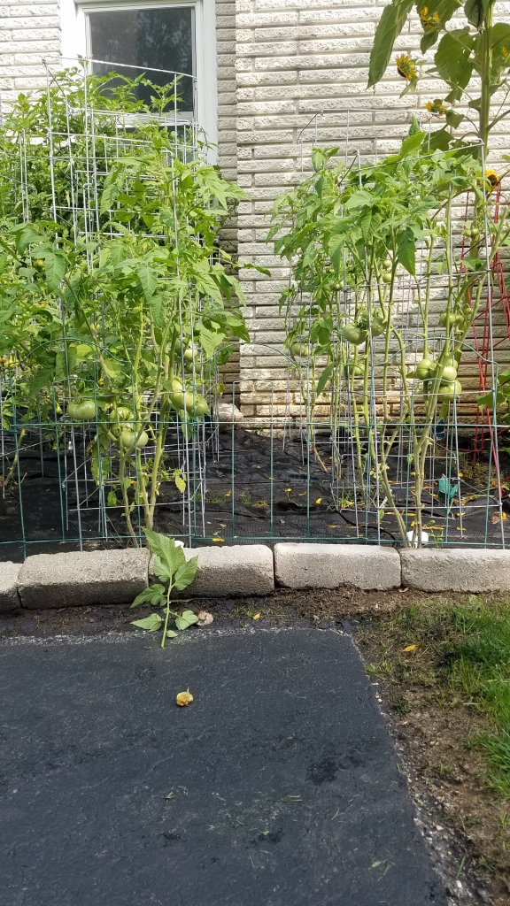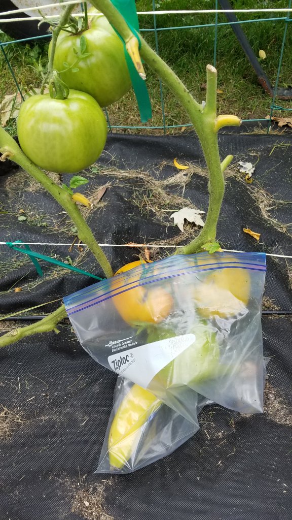 6) Trimming occurred…we focused on those with less than perfect leaves. It is obvious that the energy from the roots is sustainable. When you hack off the leaves, the energy is sustained temporarily and can force a ripening. That is a hit or miss method. We are careful not to trim more than 1/3 of the plant in a single haircut each week. We start with removing unhealthy leaves and later in the season, remove those that won’t contribute to ripening. That includes those outside the Burpee cage, we cut all suckers without mature fruit, or no fruit. To be safe, we hit the plant with Miracle Grow, after a drastic cut. After all, we could be totally wrong about the frost and will need photosynthesis. If all the leaves are gone, it will die and drop the geen babies. If it quickly grows new healthy leaves, it will extend the season!