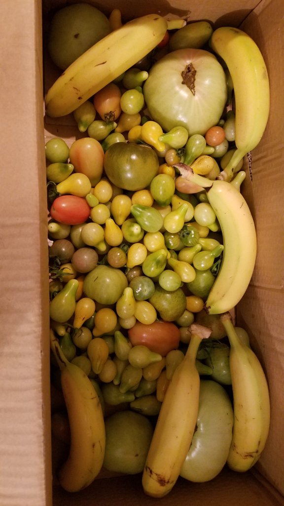 3) Picking the barely ripe a day ago and get green bananas to gas them in a box in the basement! Again, I picked all the pink and yellowed babies and paired them with boxes of green bananas.