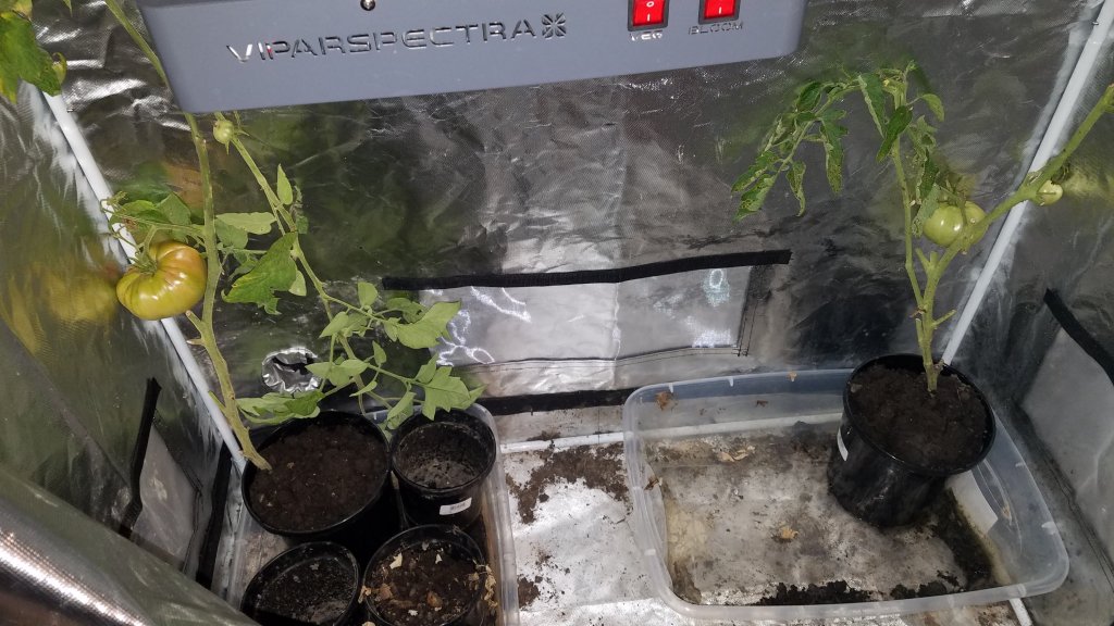 1) Pull the plant “out of the ground” and put it in a grow tent with synthetic light schedules: We experimented with 2 plants. After 24 hours, the Brandywine had some pink skin and the plant leaves perked up! It was on its way to a vine ripen! Unfortunatly, the Golden Jubilee’s leaves drooped. Well, both seemed promising for a sweet tomato, compared to box ripened. With greater risk of frost, we are considering this method on more plants. If they can ripen in the tent, they should result in the juiciness of a vine ripened tomato!