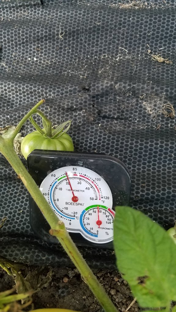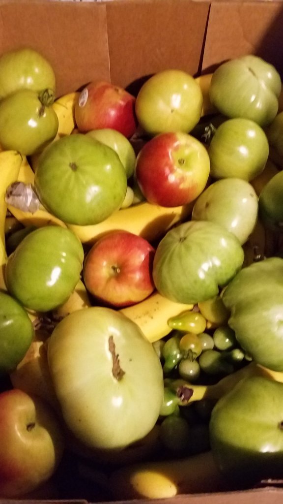 We read up on ideal tomato ripening conditions. They included 70F-80F degrees during the day and no less than 50F degrees at night and no more than 80% humidity. That temporary greenhouse offered the solution. Someone had to monitor and maintain conditions. Oddly, I had the time to check on them. Within a day, we found pinkish areas of the massive babies and moved them into the hyper ripe banana /apple boxes.