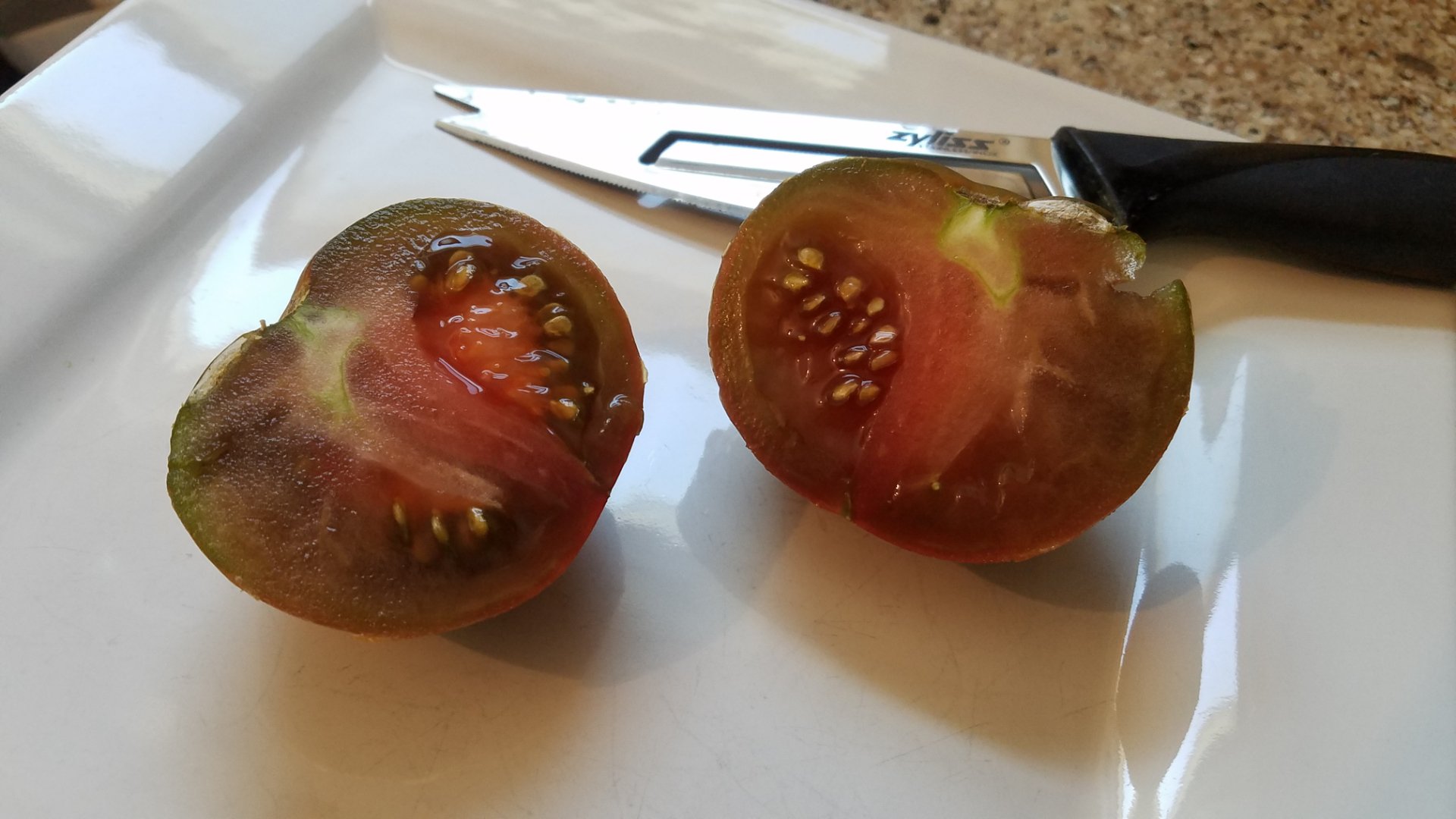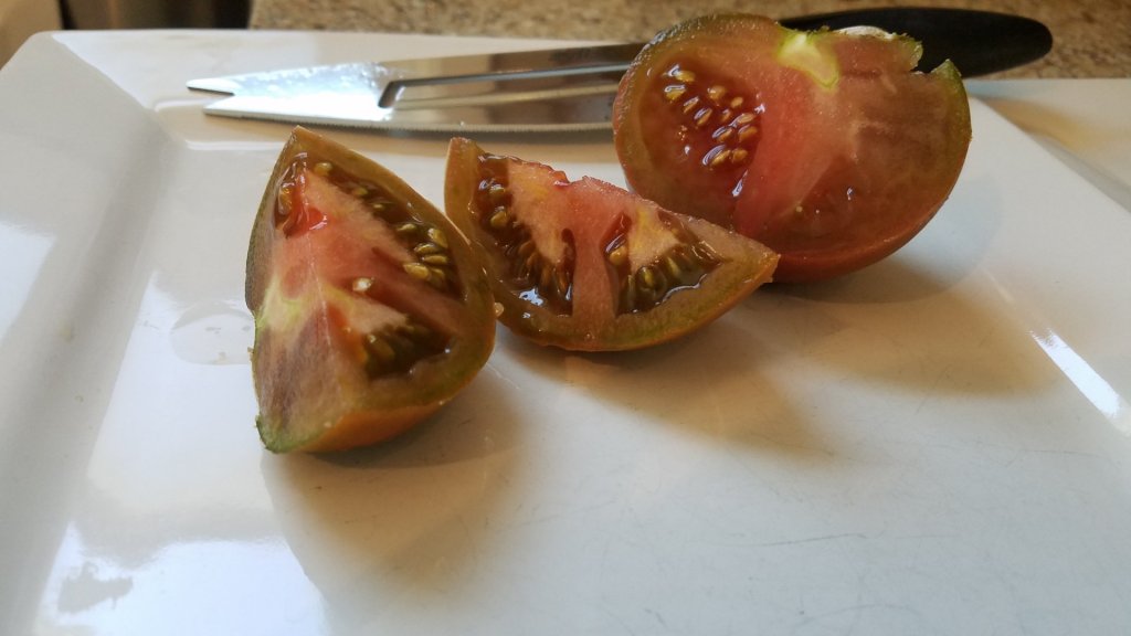 The Black Prince Tomatoe was a fashionable delight. Oddly, we had only one ripened but it popped and we couldn’t donate it due to its appearance. Instead, we decided to photo its fanciest sides.