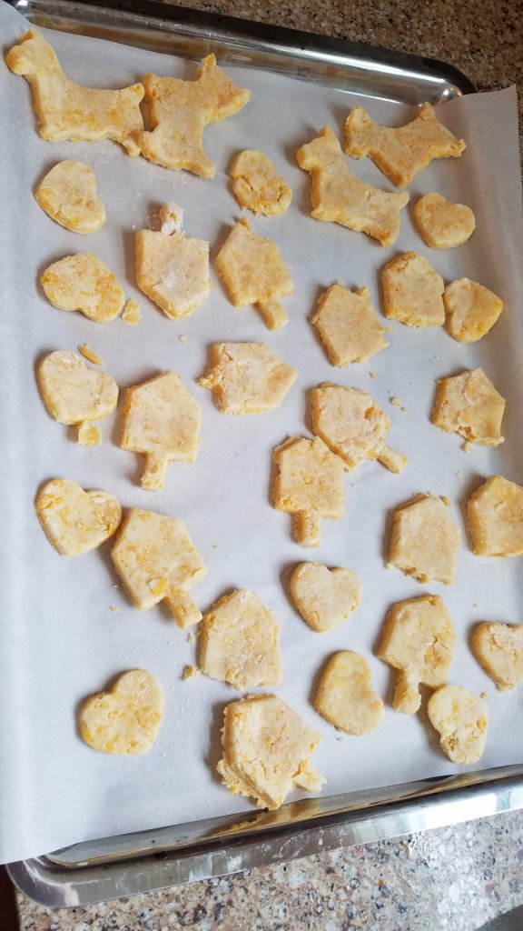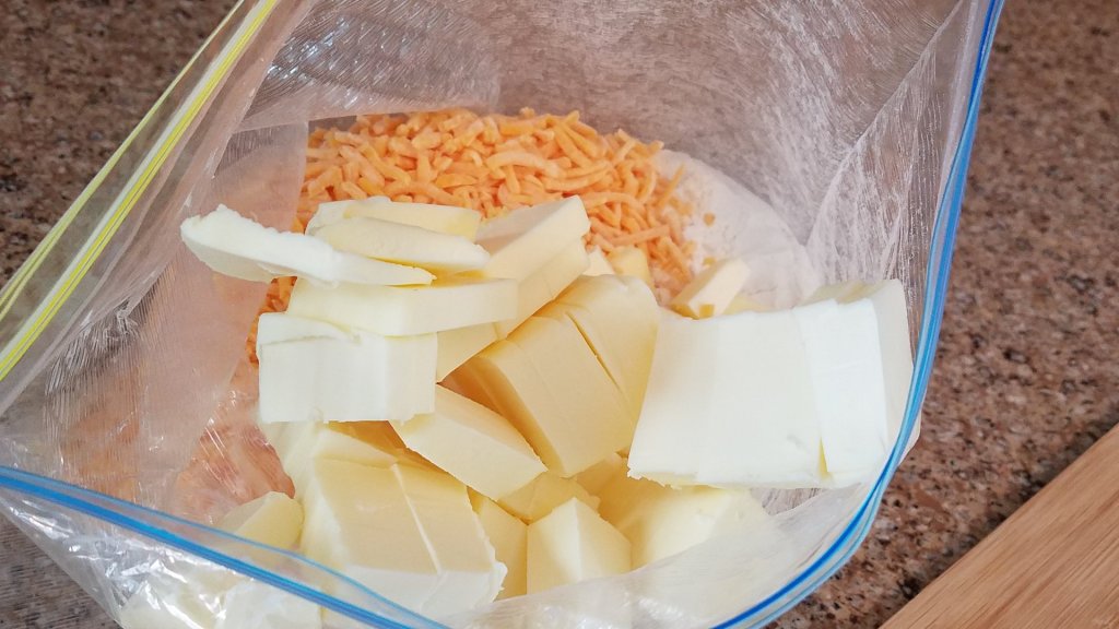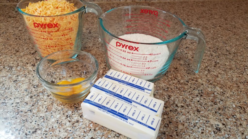 It’s really cold in our Northern Wisconsin state, -2 degrees with a -15 degree wind chill, so making cheese crisps was on the schedule. Naturally, we had 4 cups of sharp cheddar cheese, 1-1/3 cups of butter and 2 cups of all purpose flour on hand.