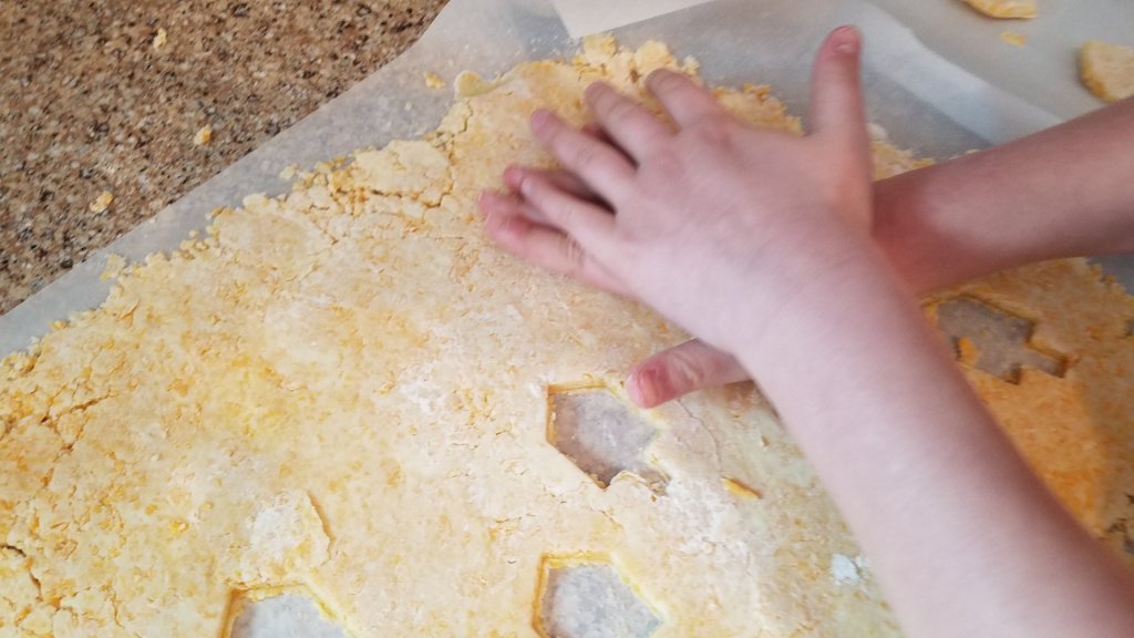 We rolled out the mixture and went to work with the cookie cut outs. The young shadow helped cut them out too.