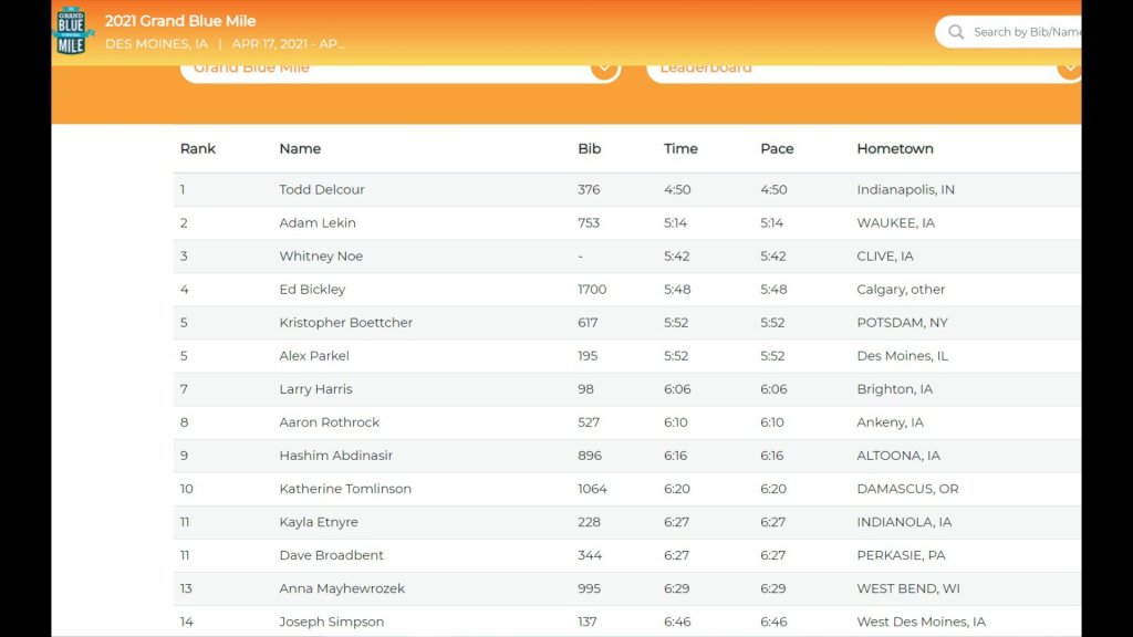 I registered my time to the Grand Blue Mile. The Leader board won’t close for another week, but it showed that I was in 13th overall and 4th place women.