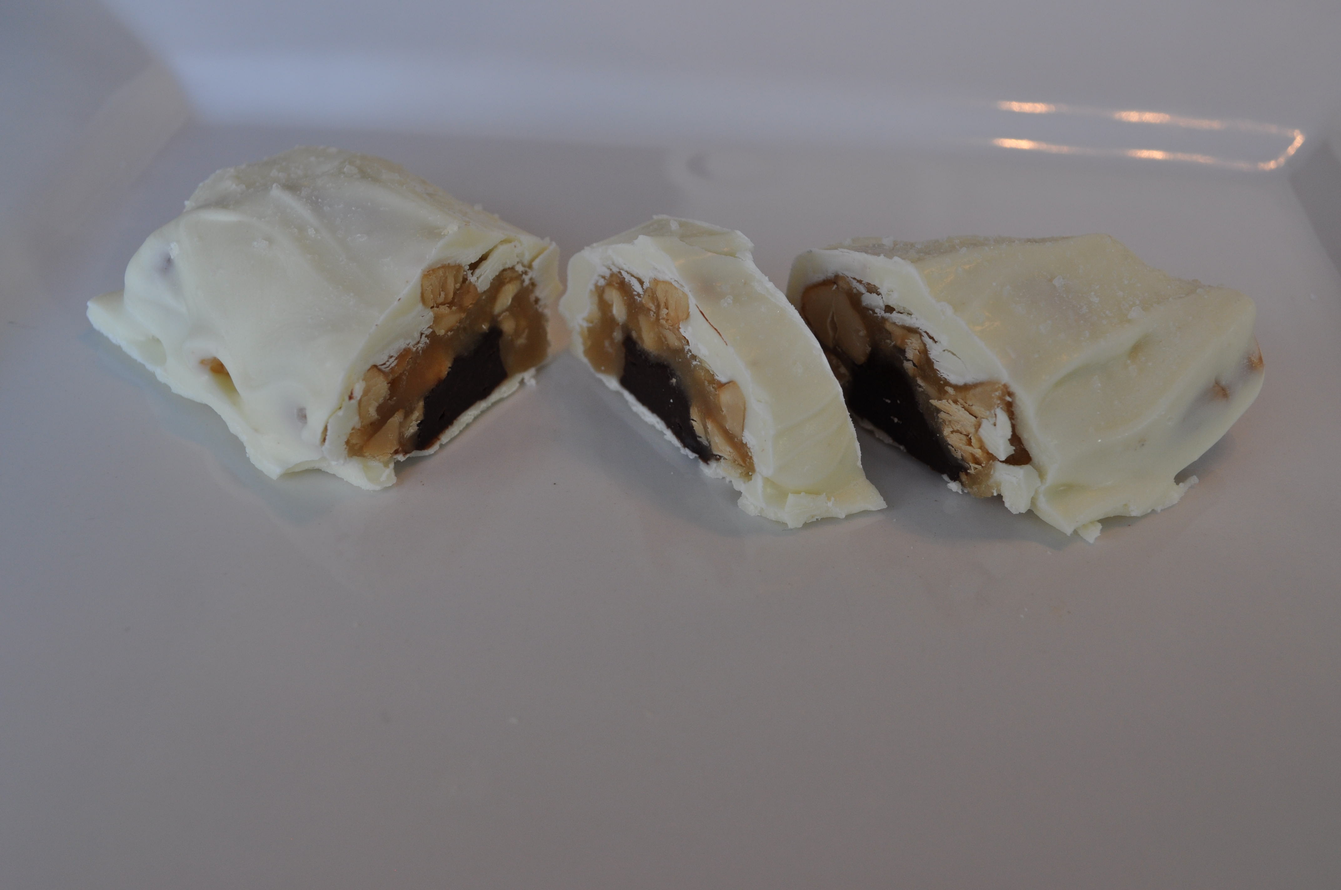 1)      Remove the fudge and wrap from the freezer.  Recut the edges and position a rectangular fudge on top of a wrap square.  Roll it around the fudge and put on a separate parchment paper line pan and freeze. Repeat for all bars.