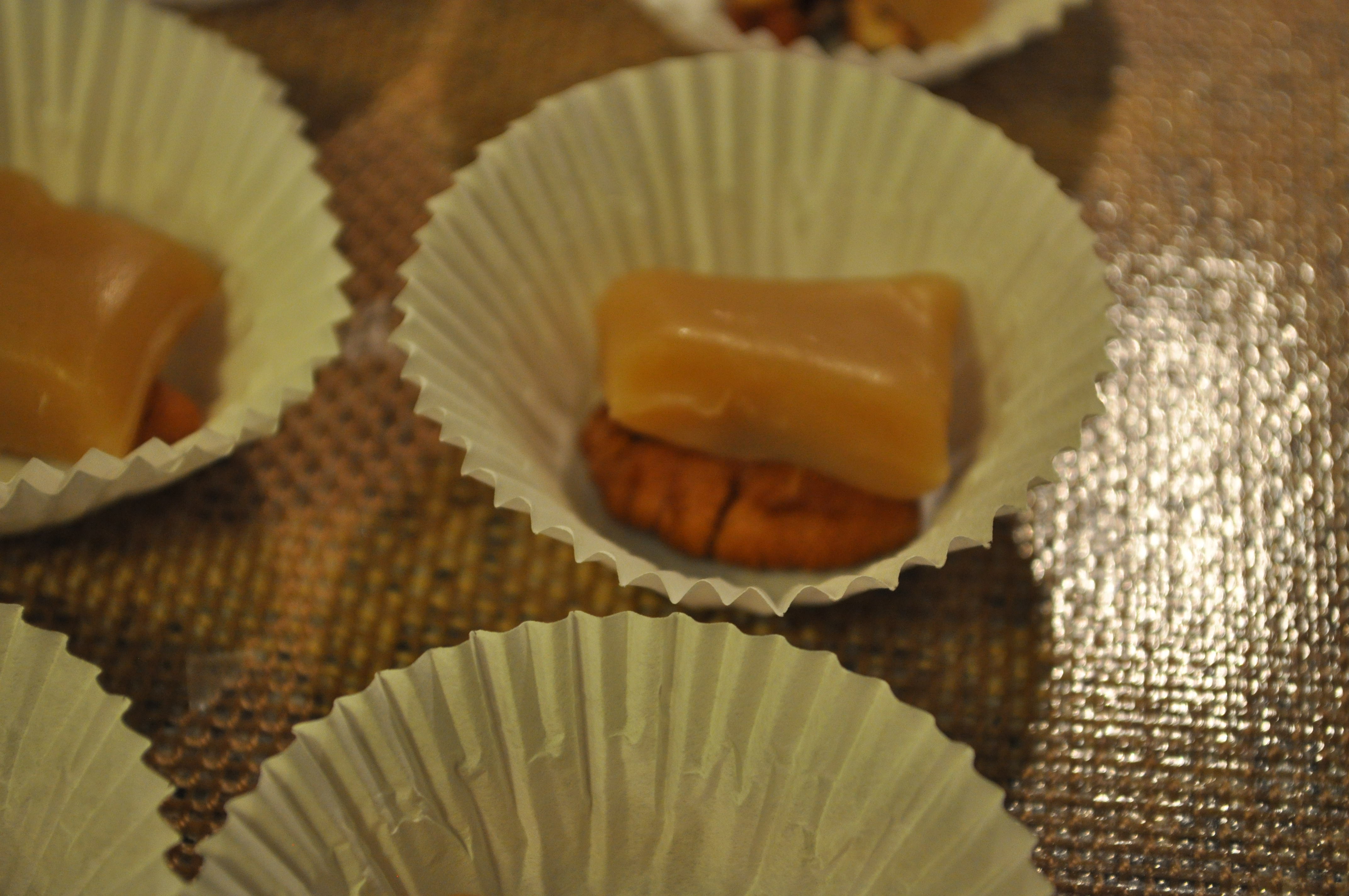 1) Lay out 16 mini cups and place a single Pecan in each.