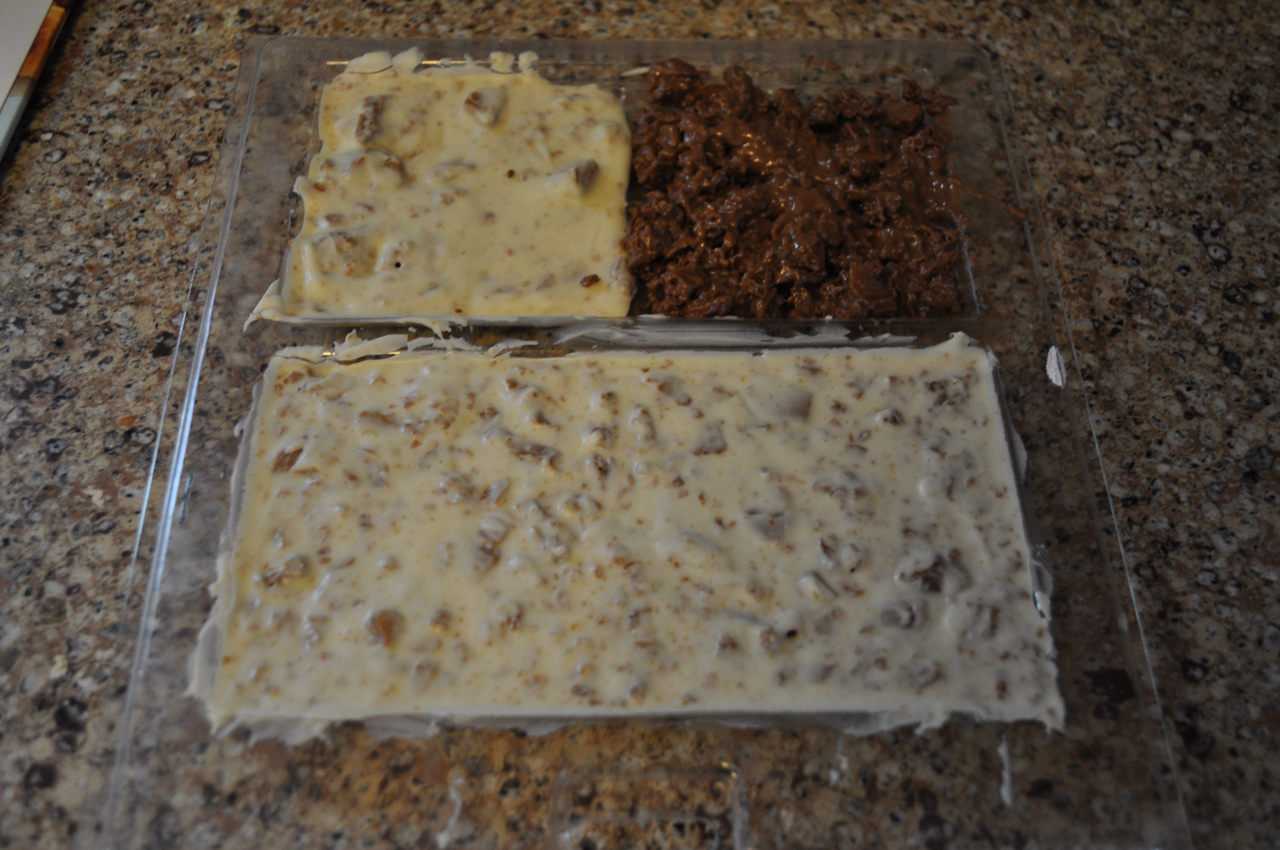 - Pour into candy bar forms and fill half way and allow to cool.