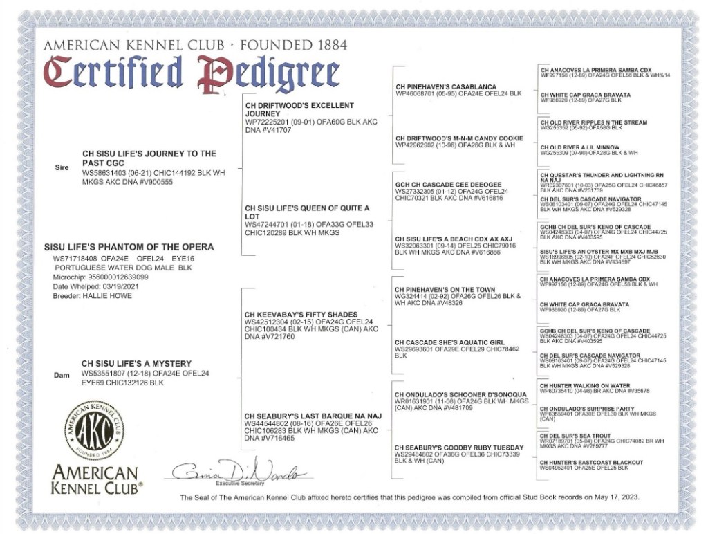 Moses and his ancestors are included in the Portuguese Water Dog Stud website, http://www.pwdinfo.com. To see photos of his ancestors, select the link.