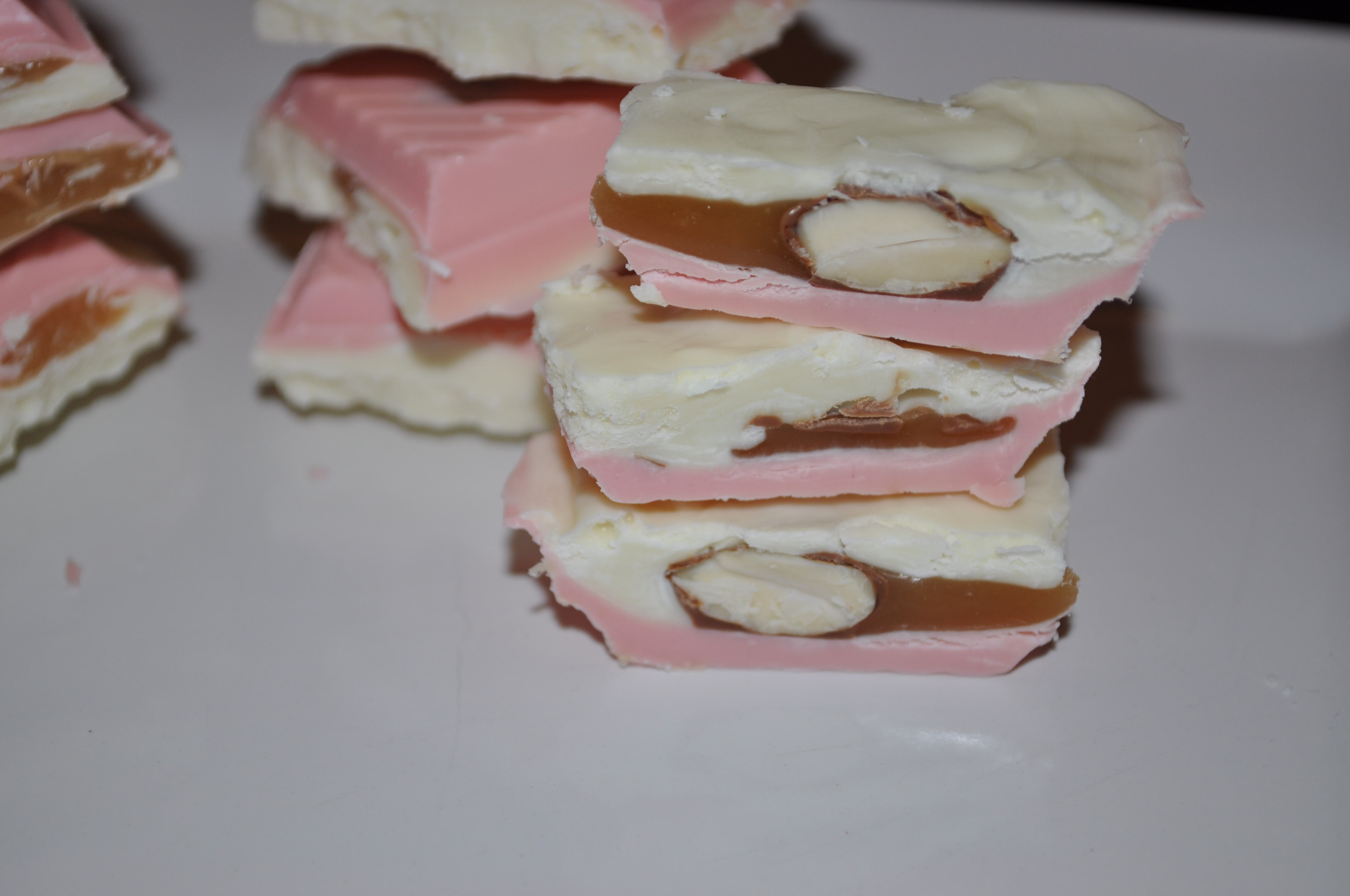 3) Set almonds on top of pink chocolate once it has set.