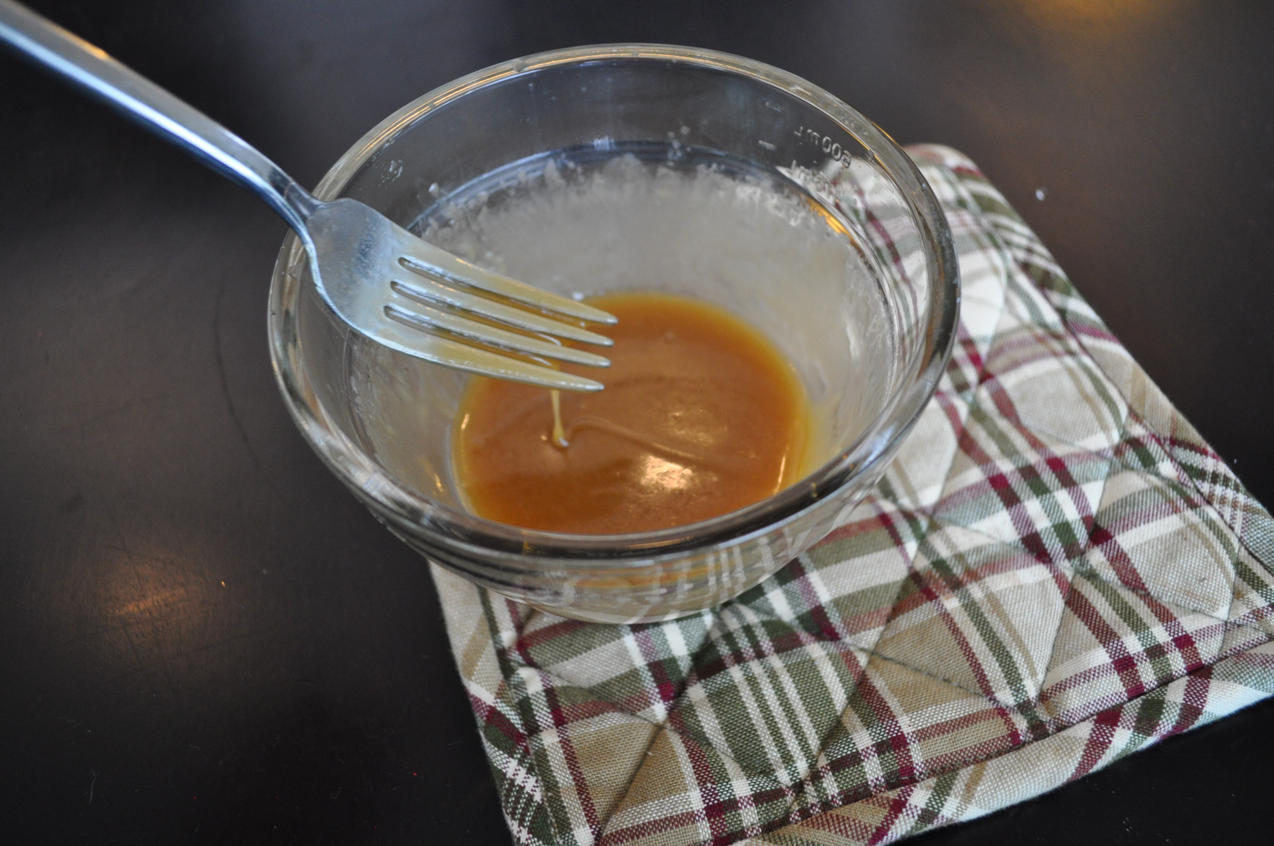 4) To test the caramel, use a fork and dip into the caramel bowl and cover a fork. Drop a single droplet into a cold bowl of water and if the mixture holds its form, it is ready. Handle the bowl with a mit to protect hands.