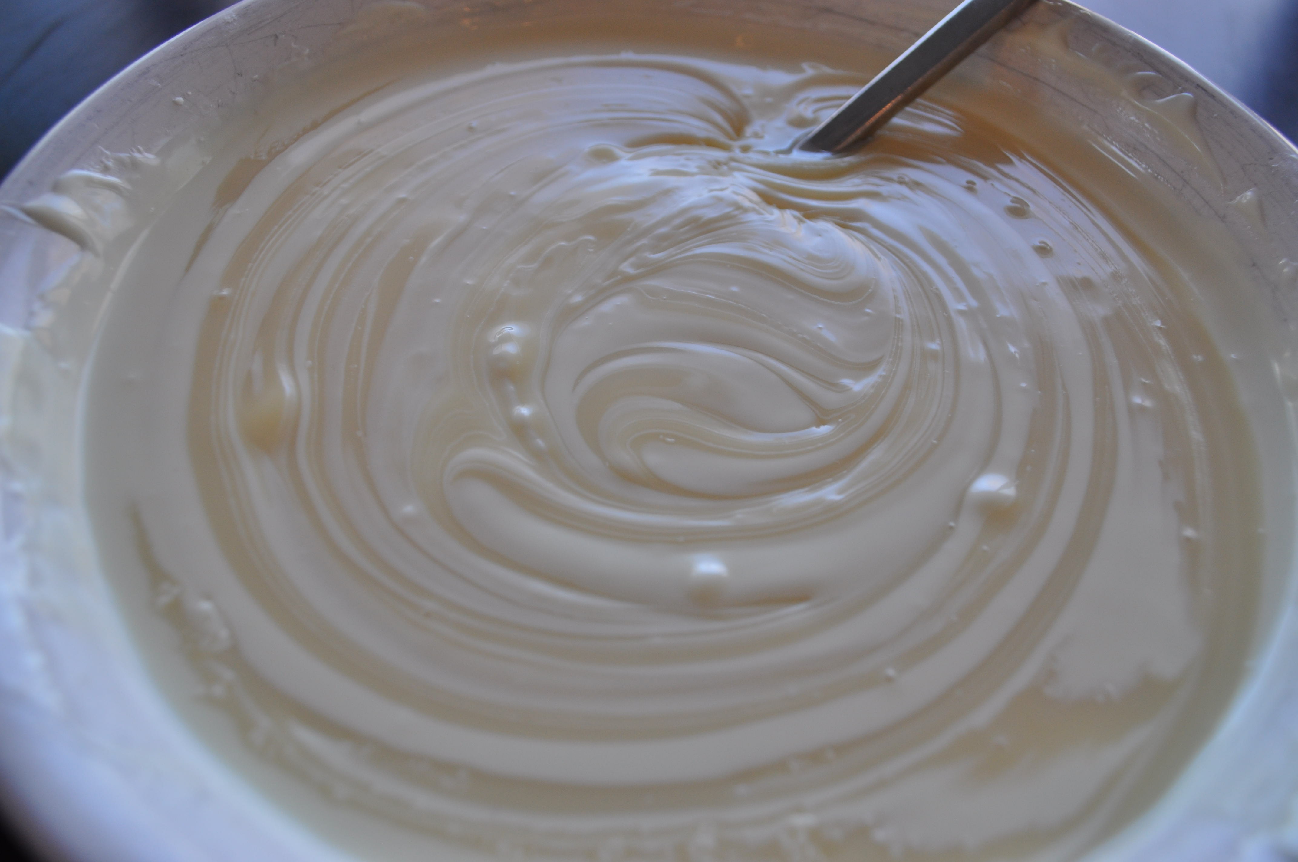 2. Mix the coconut oil with the chopped white chocolate. Melt in the microwave in 30 second increments until the mixture is mostly smooth. Tip: Ensure the bowl never becomes too hot to touch.
